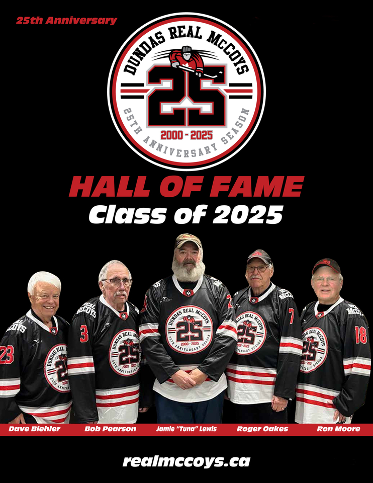 The Dundas Real McCoys are pleased to welcome to the Hall of Fame five men who have been with the organization from the very start, Dave Biehler, Bob Pearson, Jamie “Tuna” Lewis, Roger Oakes and Ron Moore.